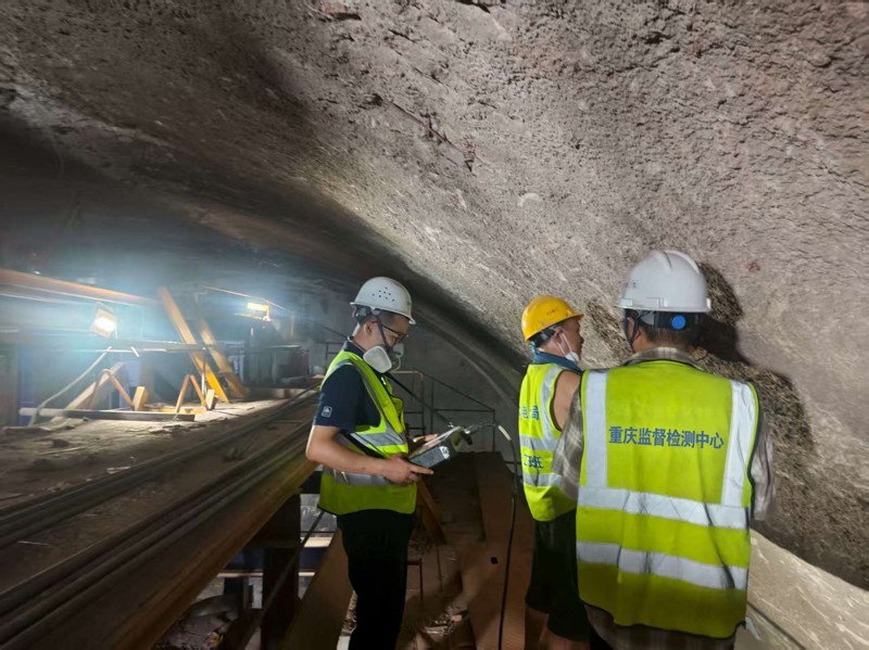 監(jiān)督檢測中心 主要承擔軌道交通27號線璧山站至磁器口站區(qū)段的工程質量檢測任務,其中對中梁山隧道區(qū)間的檢測涵蓋多項關鍵內容:包括建筑材料、錨桿拉拔力、襯砌厚度、襯砌及背后密實狀況、錨桿錨固密實度、襯砌混凝土強度及保護層厚度等檢測。為確保項目如期貫通,市建科院統(tǒng)籌調配人員、設備資源,組建專業(yè)技術團隊,制定周密檢測方案。工作聚焦隧道襯砌結構質量檢測的核心環(huán)節(jié),高效推進各項檢測任務,以及時響應、精準可靠的數據,為施工質量筑牢保障防線。